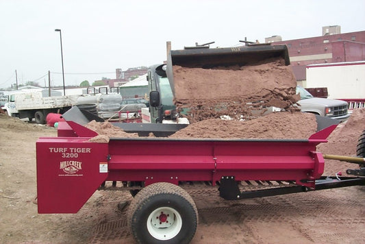 Millcreek | Small Top Dresser | Model 2100 Turf Tiger | 28 cu. ft. Capacity | Ground Driven | Horsepower15HP | For Tractor