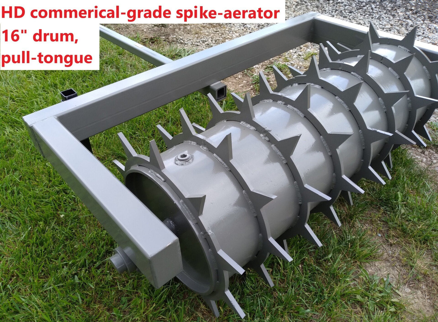 HD Commercial Grade Spike-Aerators is built on a 3/8” thick, 16” diameter drum. The 2" solid steel axle is supported by quality grease-able bearings. Depending on size, the frame may be built with 3x5, 4x6, or 6x8” rectangular tubing with cross-bracing and gusset supports as necessary to ensure exceptional strength, smooth operation, and durability.