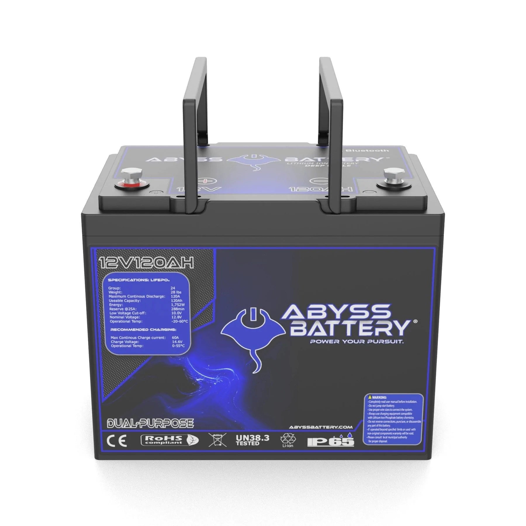 Abyss® | Dual Purpose Lithium Marine Battery | Model AB-12V120-BT | Group 24 | Voltage 12V 120Ah | 1500A Peak CCA | Bluetooth BMS | IP65 Waterproof