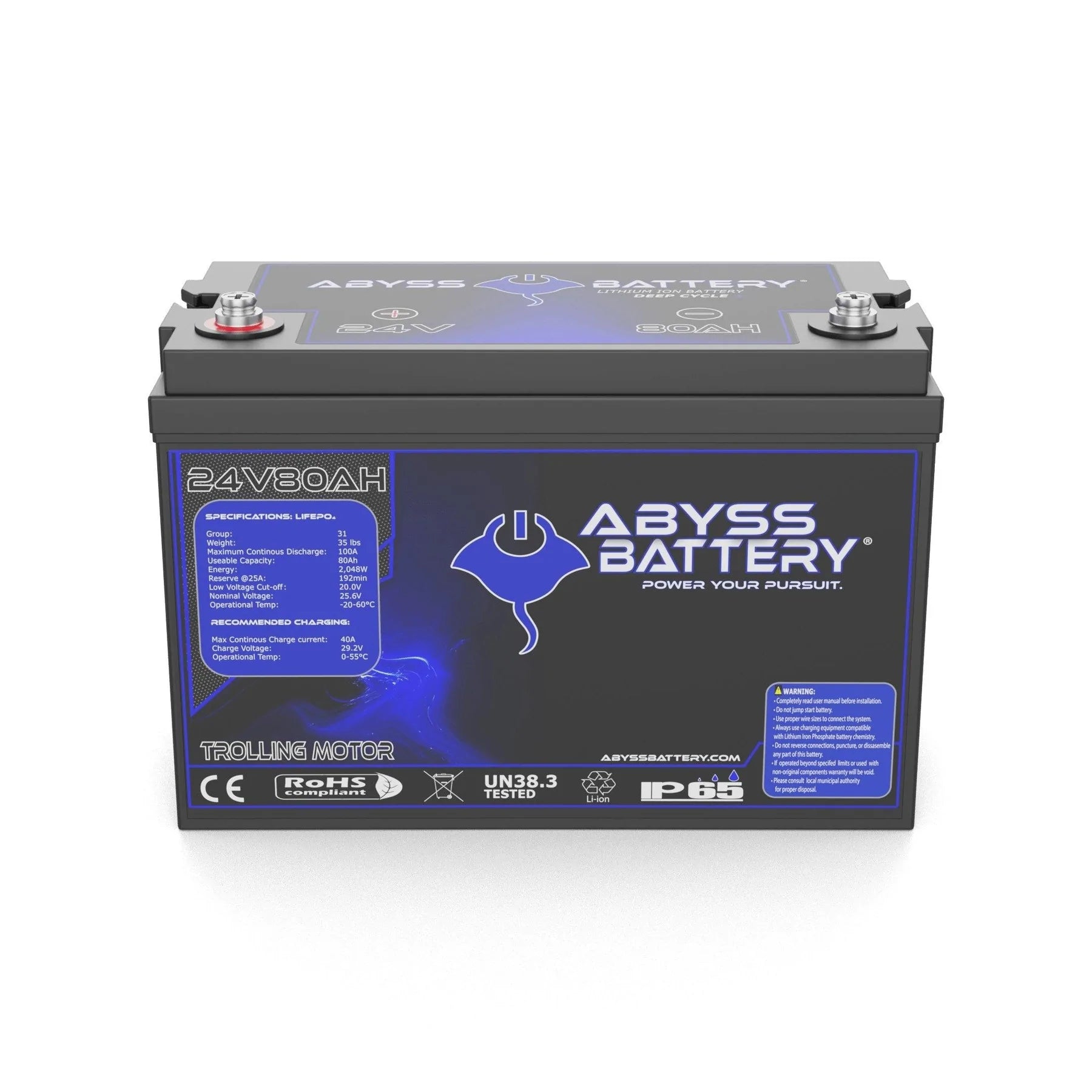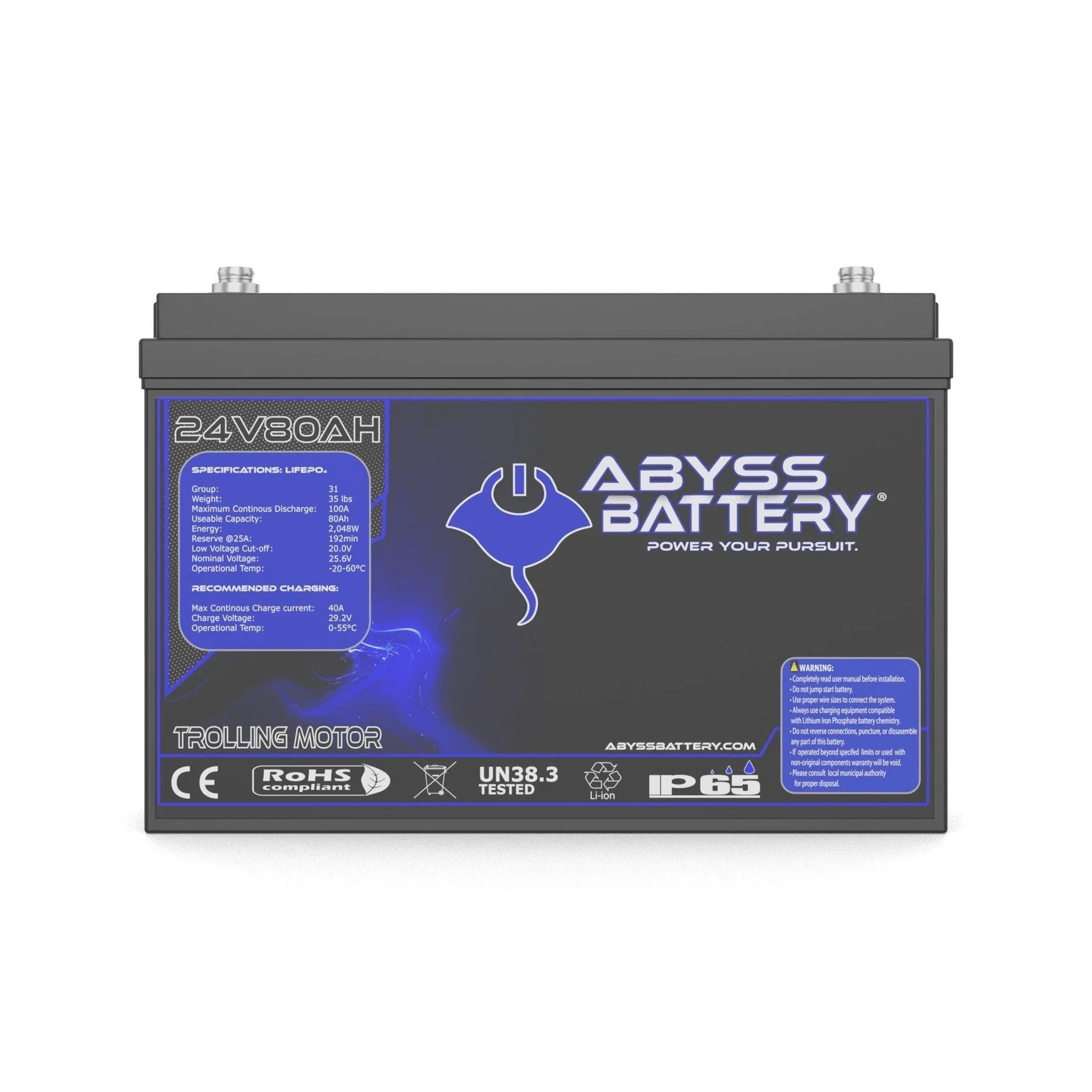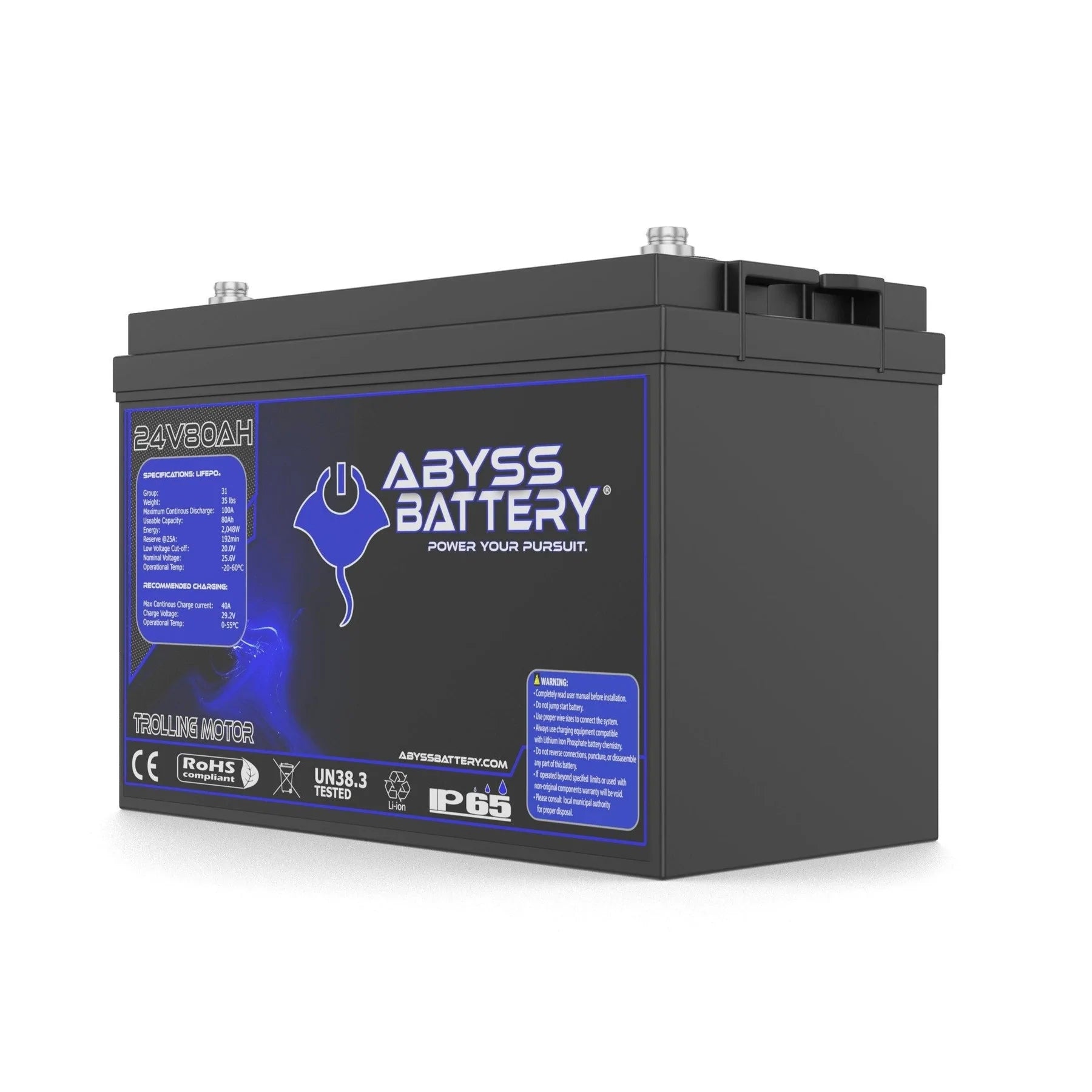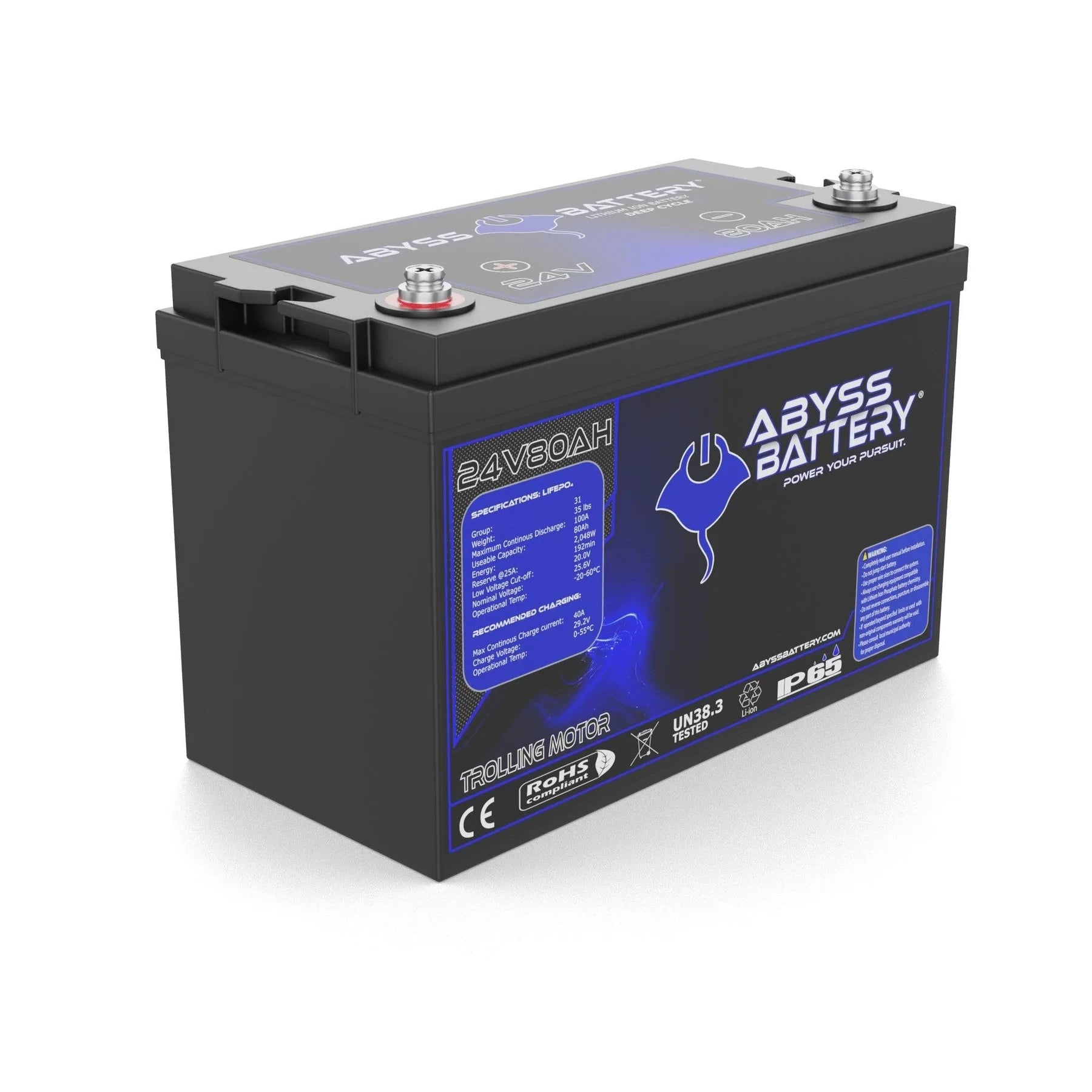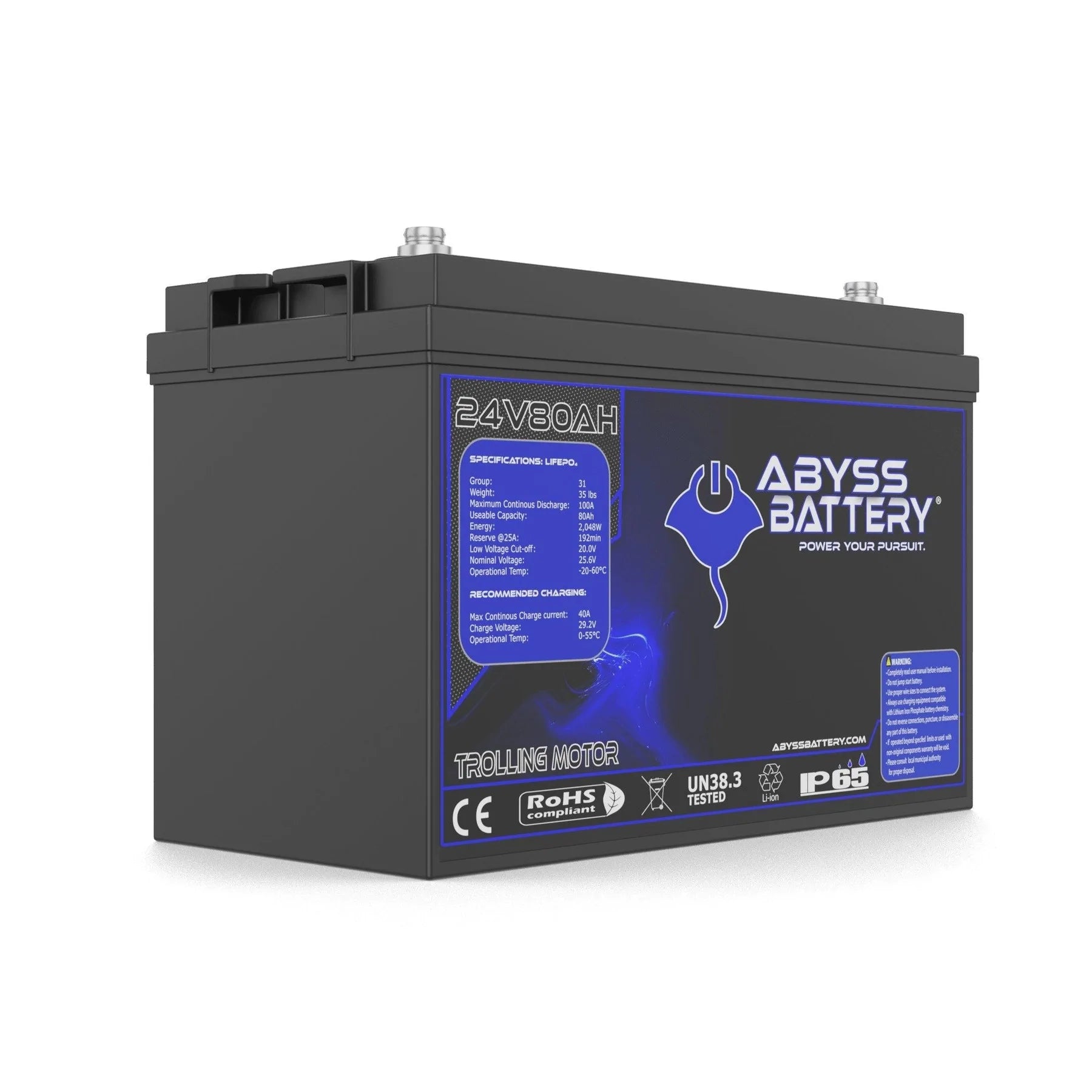 Say goodbye to the frustration of unreliable trolling motor batteries with the Abyss® 24V 80Ah Lithium Trolling Motor Battery your ultimate fishing companion designed to power your adventures for days on end. This advanced lithium iron phosphate battery replaces bulky and heavy lead-acid setups, consolidating power into a lightweight, compact single Group 31 unit that frees up valuable storage space on your boat.
