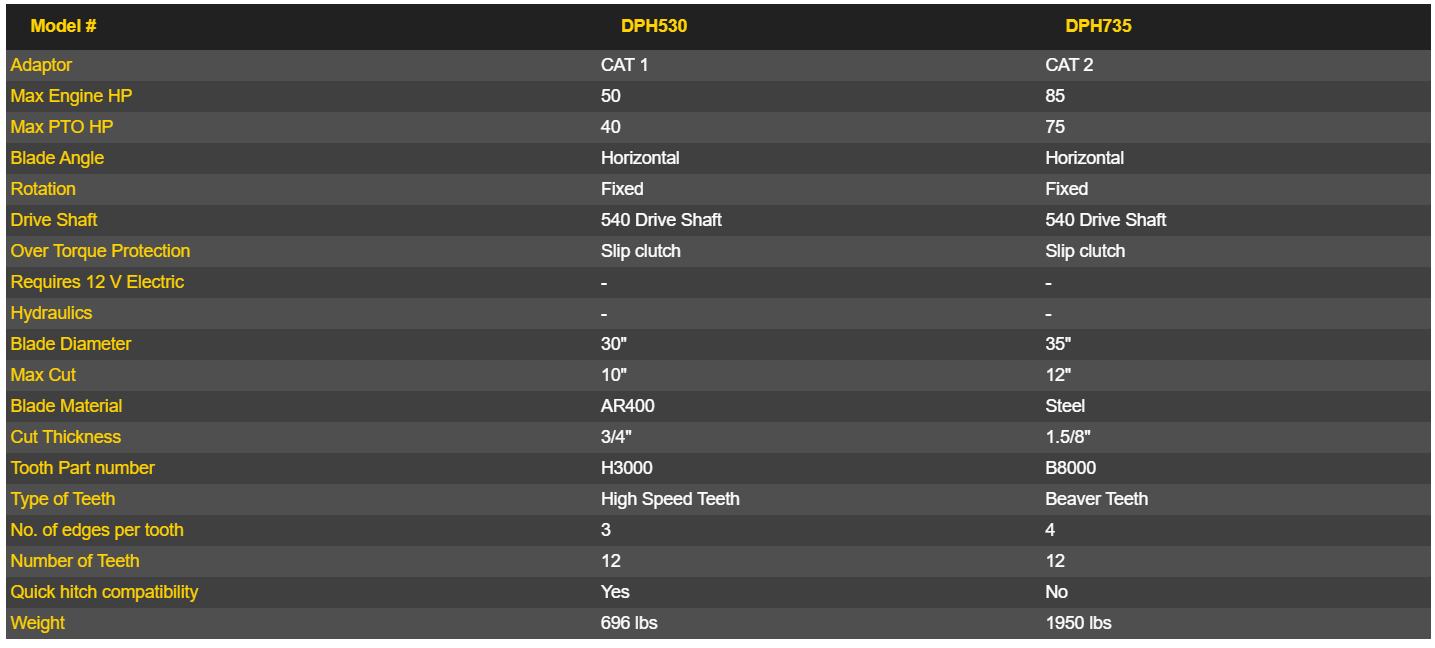 Available in two robust models the DPH-530 (30" blade) and DPH-735 (35" blade) these 3-point hitch tree saws are powered via your tractor’s PTO (Power Take-Off) and designed for tractors ranging from 50 to 85 HP. Whether you’re clearing trails, reclaiming pastureland, or maintaining a woodlot, these saws deliver clean, efficient cuts up to 12 inches in diameter, while staying low to the ground for a neater finish.