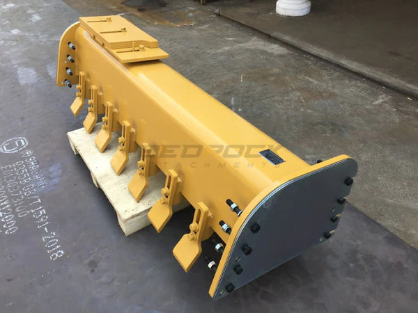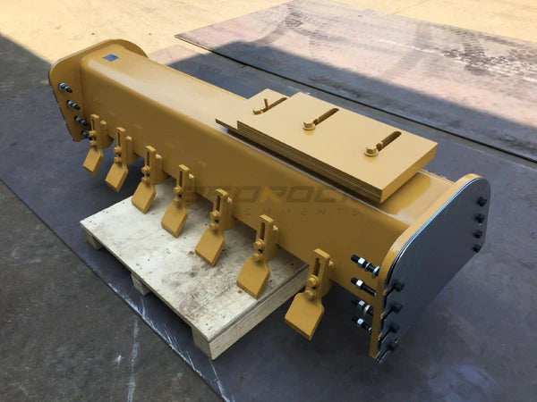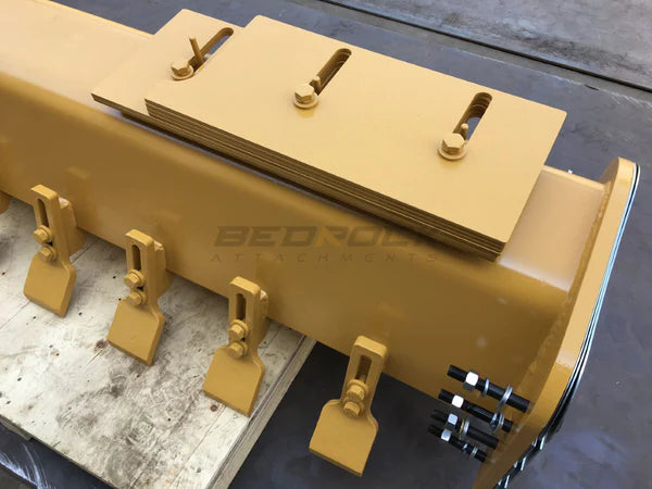 The Bedrock Attachments Interchangeable Bumper (SKU: RS11) is a high-quality attachment designed for CAT CS64, CS74, CS76, CS683E, CP76 Rollers. This bumper is engineered to accept OEM-style parts, ensuring compatibility and ease of maintenance. It is painted to match OEM equipment yellow and ships fully assembled with mounting hardware for quick and easy installation. It is designed to work seamlessly with CAT 84" Pad Foot Shells.