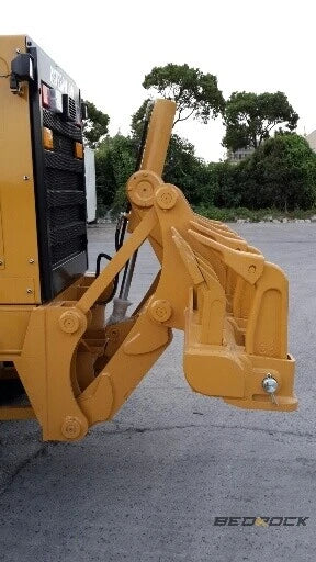 The Bedrock Attachments Multi-Shank Ripper (Model MR09) is designed for CAT 14M, 14H, and 14G motor graders, providing exceptional ripping performance for tough grading and excavation tasks. Featuring a parallelogram-style design, it includes seven ripper shanks with tips and a single cylinder, ensuring efficient ground penetration and durability. The ripper is compatible with OEM-style parts, including cylinders and seal kits, for seamless integration and maintenance. Painted in OEM equipment yellow, it matches CAT motor graders perfectly. The ripper ships fully assembled with all necessary mounting hardware, making it ready for immediate use.