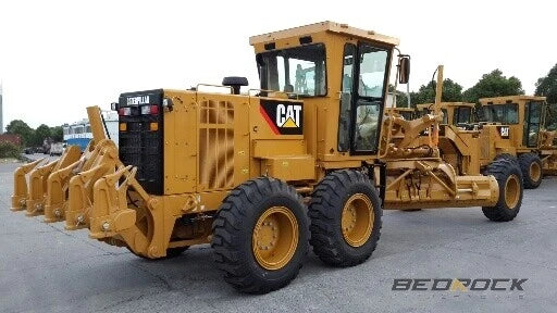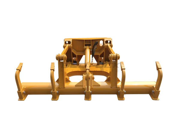 The Bedrock Attachments Multi-Shank Ripper (Model MR11) is designed for CAT motor graders, including models 120H and 135H, offering exceptional ripping performance for tough grading and excavation tasks. Featuring a parallelogram-style design, it includes five ripper shanks with tips and a single cylinder, ensuring efficient ground penetration and durability. The ripper is compatible with OEM-style parts, including cylinders and seal kits, for seamless integration and maintenance. Painted in OEM equipment yellow, it matches CAT motor graders perfectly. The ripper ships fully assembled with all necessary mounting hardware, making it ready for immediate use.