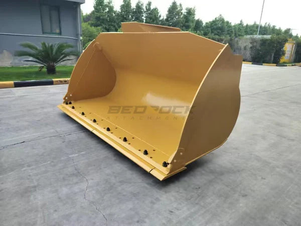 The Bedrock Attachments Quick Coupler Bucket (SKU: WLB938FC-108-2.7) is a versatile and efficient bucket designed for CAT 938 series loaders. Constructed from high-strength steel, this bucket is engineered to endure tough working conditions while maintaining optimal functionality. With a capacity of 2.7 m³ (3.6 yd³) and a width of 2727 mm (108 inches), it ensures efficient digging and material handling. The bucket is painted to match OEM equipment yellow and black, providing a professional appearance, and is compatible with OEM-style parts for seamless integration. It features a bolt-on edge and optional bolt-on teeth, making it versatile and easy to install.