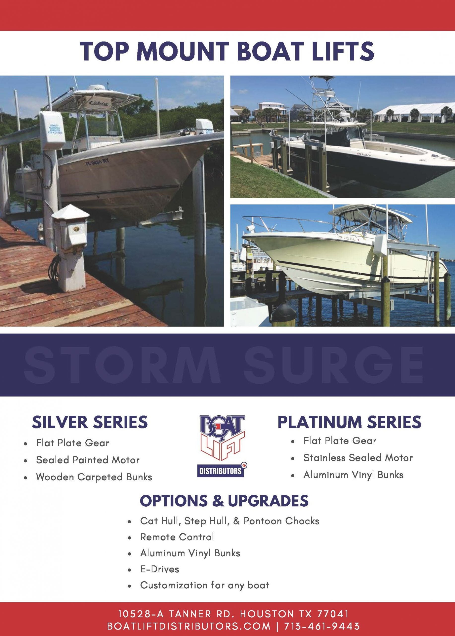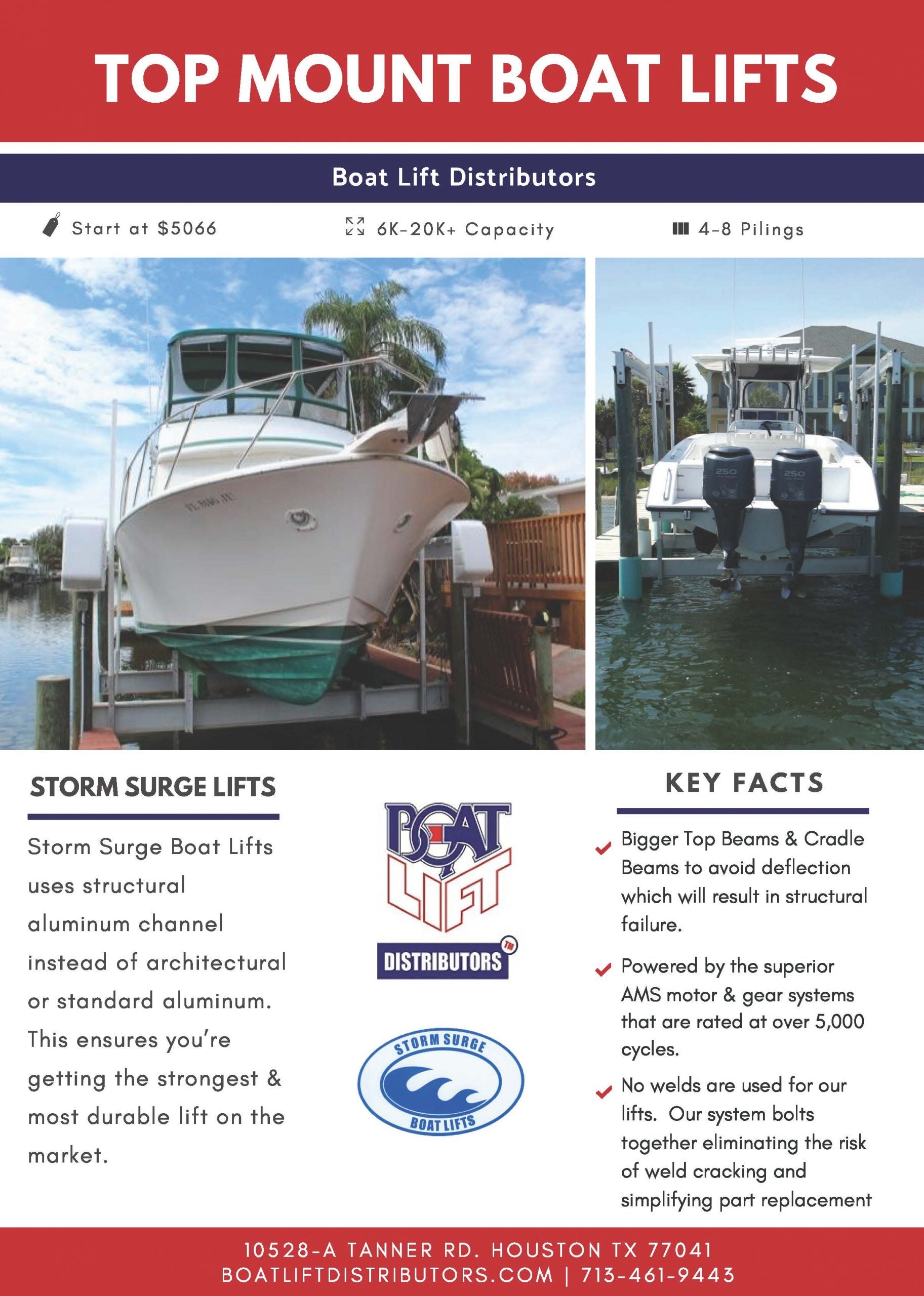 Boat Lift Distributors | Storm Surge | SS 12,000 LB Top Mount Boat Lift | Model Stormsilv9k4 | Lift Capacity 12,000 lbs | Dual Sealed TENV 1 HP Motors | For Lakefront & Coastal Boats