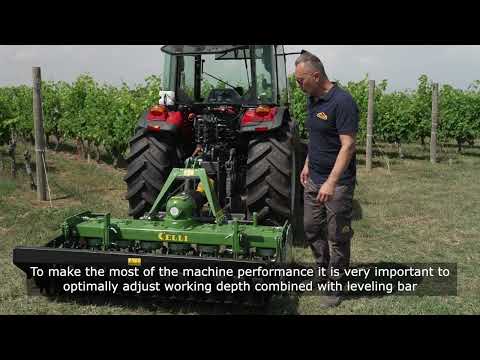 The Celli fixed power harrow is made for low power tractors that work in deep soil and in orchards and vineyards. It prepares seedbeds, eliminates soil compacting and varies the degree of soil finishing according to specific needs All standard machines are supplied with low PTO position gearbox (to fit tractors with PTO height between 45 and 55 cm) except for model 250, supplied with high PTO position gearbox (to fit tractors with PTO height between 55 and 65 cm). Technical note The bar, provided on request, is adjusted with pins or screws. It can be set to several positions, modifying the distance from the tines and the work angle. This adjustment allows an adequate setting in all working conditions, thus minimizing power absorption.