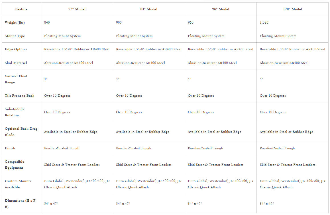 | Optional Back Drag Blade | Available in Steel or Rubber Edge | Available in Steel or Rubber Edge |
