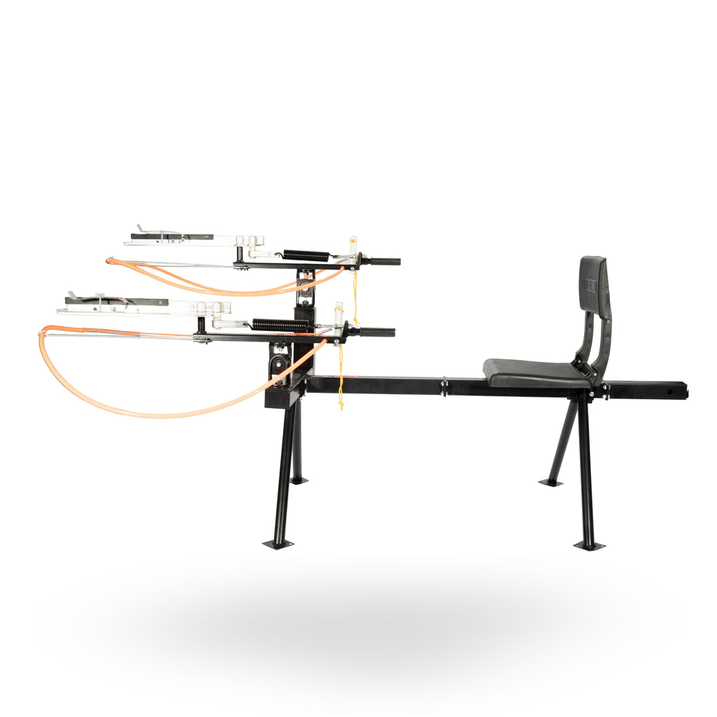 Built from cast steel and aluminum tubing, the trap offers long-lasting durability and weather resistance. It assembles in minutes and mounts conveniently on a standard 2″ trailer hitch. The comfortable fold-down seat and easy cocking geometry make extended shooting sessions effortless, while the positive-lock trigger ensures safe operation. Comes complete with an adjusting wrench and is backed by a 1-year clutch warranty.