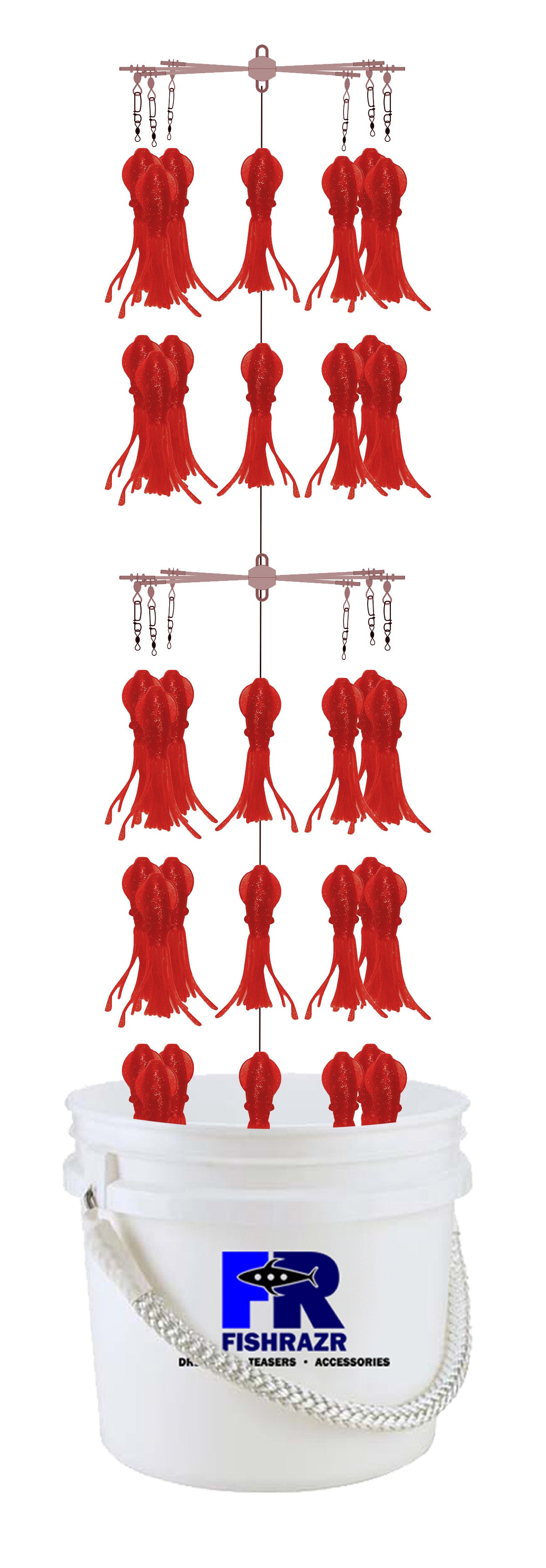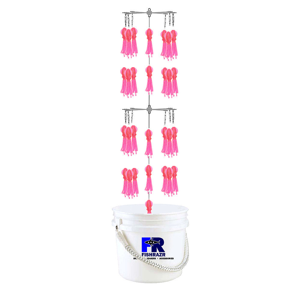 A small compact dredge that’s a big tease. A two tier dredge that fits in a 3.5 gallon bucket. Open the bucket and you will find a two tier dredge with our U.V Tournament grade squid (phat or 9") The dredge is ready to fish, it includes a connector cable and 4lb lead fish weight. Available in 4 colors, comes in a storage bucket with rope handle and lid.