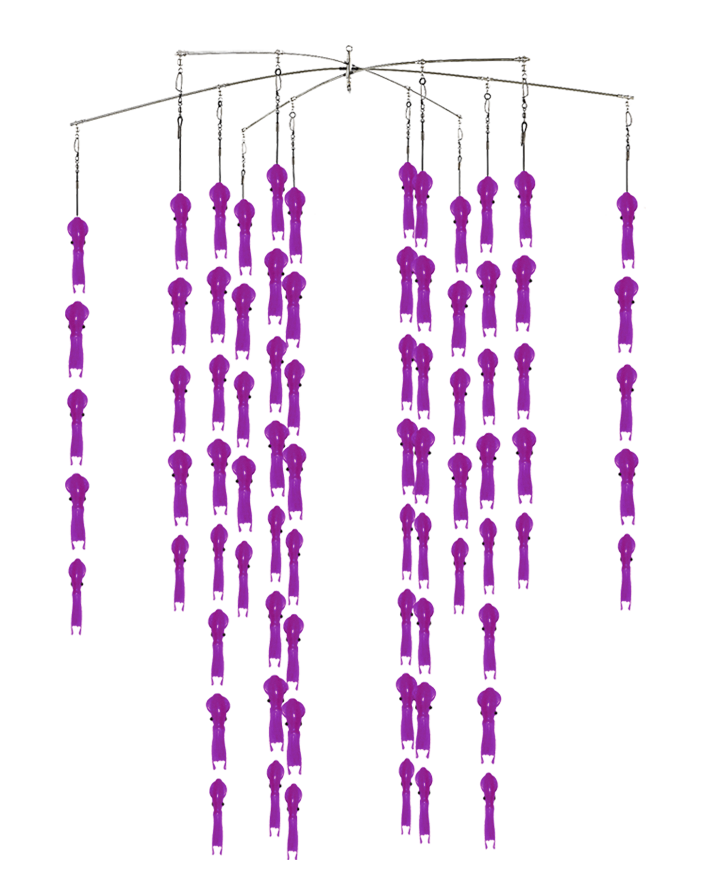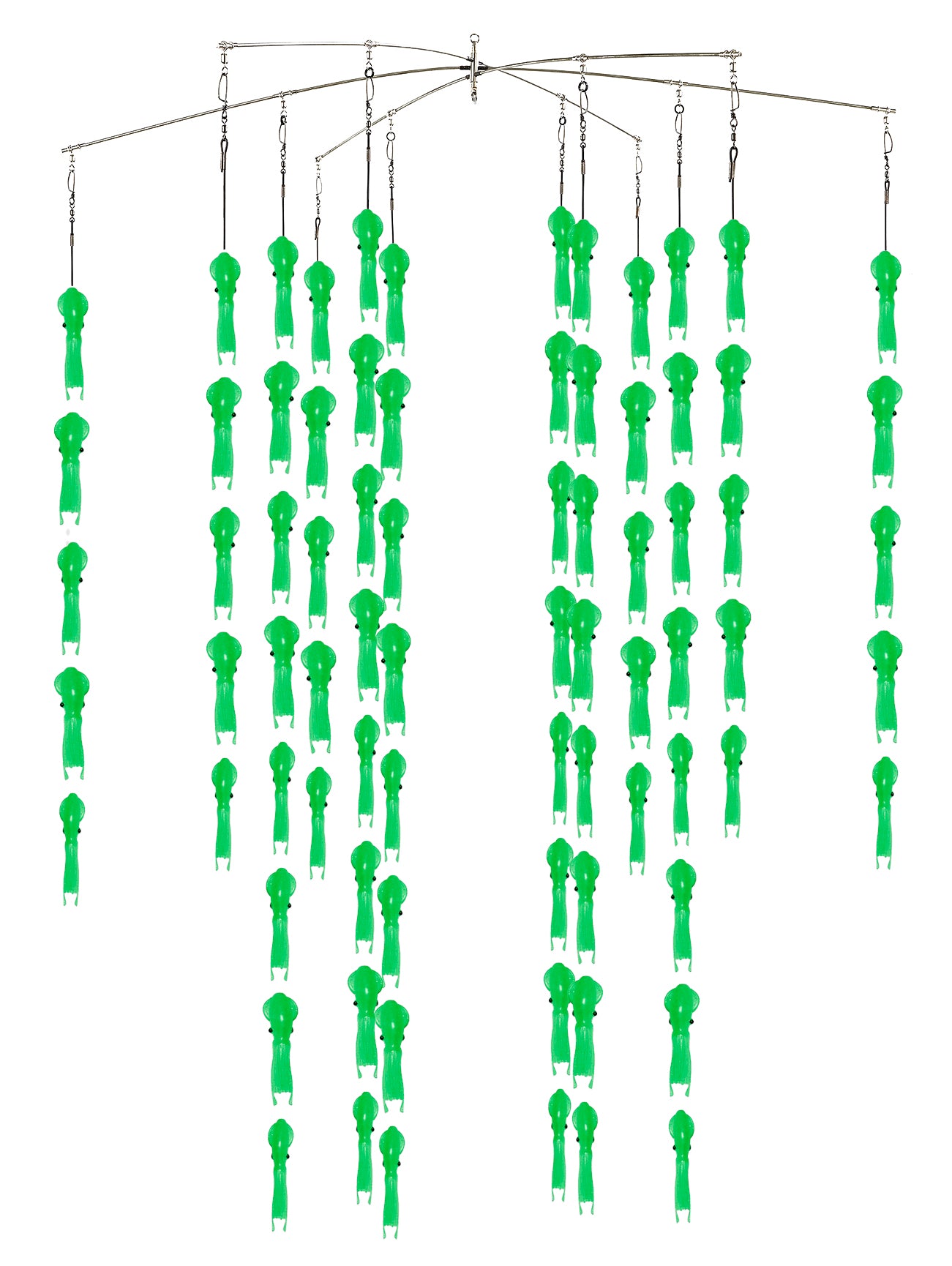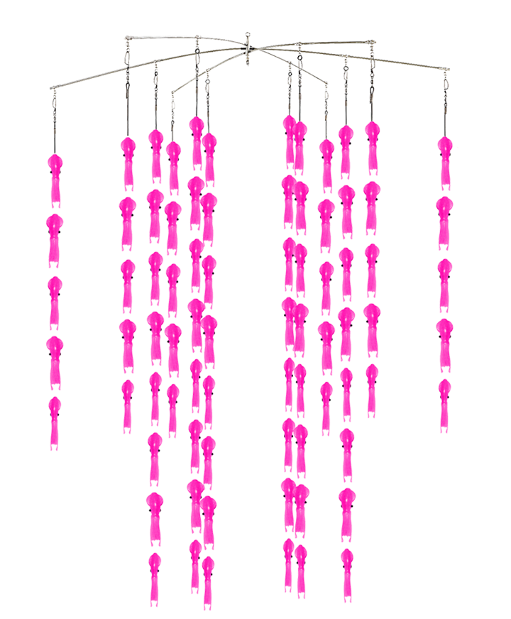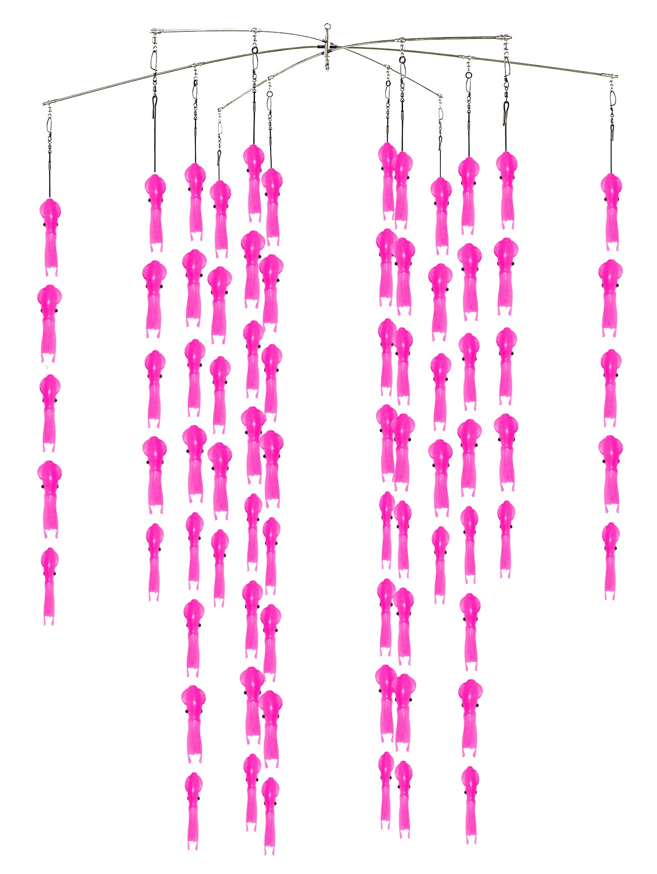 When you want a lot of baits in a small package, this is your choice. This is a compact dredge that packs a punch that can be easily pulled by any size boat. 100 Phat squids hanging from a 28” heavy dredge bar. Chains of 5 Phat squids adjourns the outside loops with chains of 10 down the inside and center. Comes in a mesh carry bag for easy storage. Available in blue sparkle, pink florescent, green sparkle, pink sparkle, purple sparkle and red sparkle. Custom color combinations available