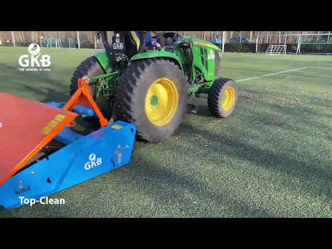 The Top-Clean is designed with two rubber wheels at the front. These wheels ensure that the machine rolls lightly over your field. A rotating brush is connected to the wheels with a chain so that the driving speed determines the rotation speed of the brushes. It sweeps and collects debris and trash while dropping the infill back into place.