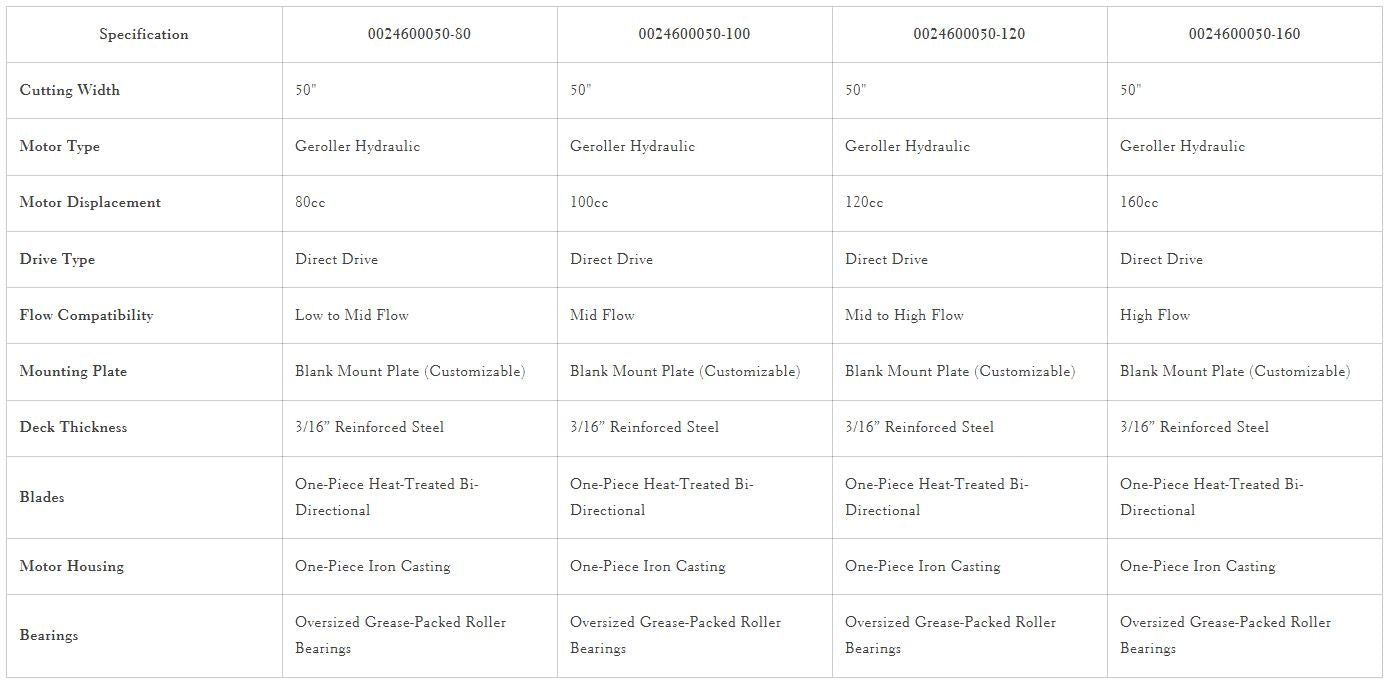 Equipped with a Geroller-style hydraulic motor, available in multiple displacements, this unit achieves optimal cutting tip speed, ensuring precise and controlled operation. The hydraulic pressure relief system prevents overload, delivering consistent performance in all working conditions.