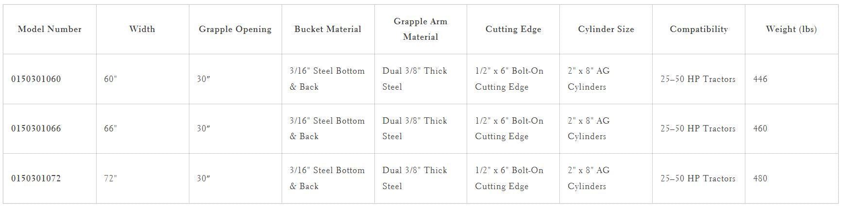| Grapple Arm Material | Dual 3/8" Thick Steel | Dual 3/8" Thick Steel | Dual 3/8" Thick Steel |