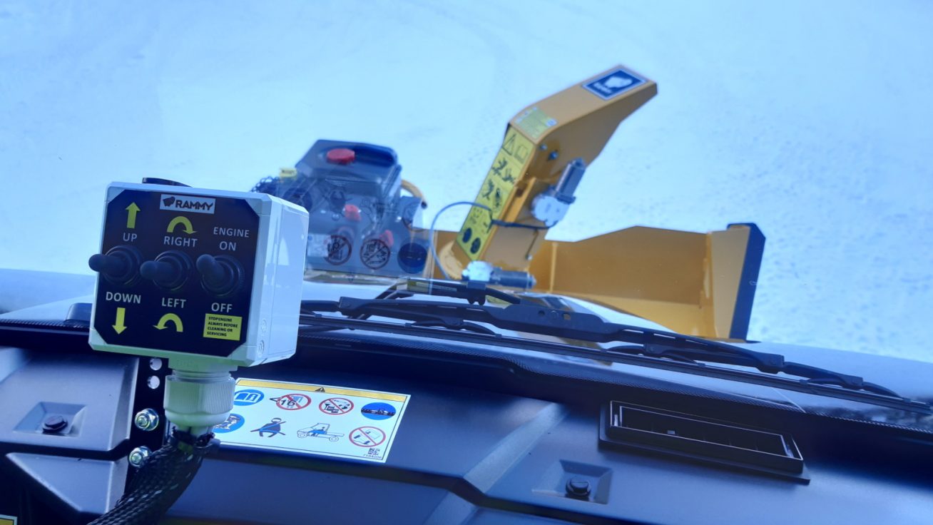 The Rammy mounts directly to UTV snowplow brackets and raises/lowers via the UTV’s winch system. Installation or removal takes only 2 minutes after initial setup. Operators control chute rotation, deflector angle, and engine shutdown from the comfort of the UTV cab using the included electric control box.