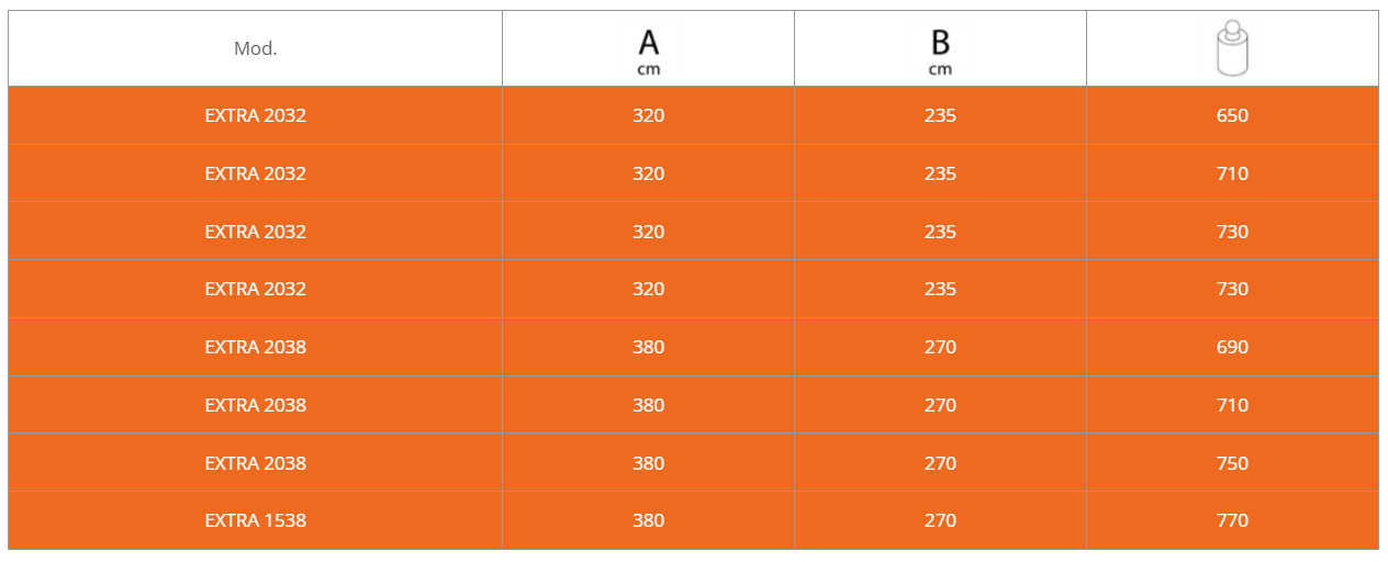 - EXTRA 2032: 126" lift height, 92.5" width, 650-730 kg weight.