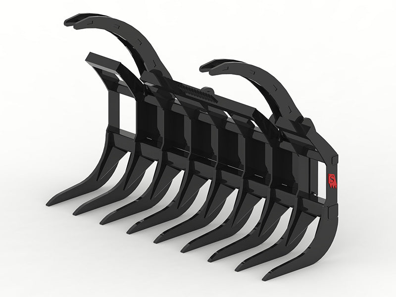 Crafted from high-strength alloy steel, the rake’s curved teeth are designed to dig, lift, and stack materials like logs, brush, rocks, and demolition debris. The rugged brush guard and center-mounted push bar ensure better leverage when handling taller materials, while the top clamps and hydraulic cylinders securely hold materials in place making your work safer and more efficient.