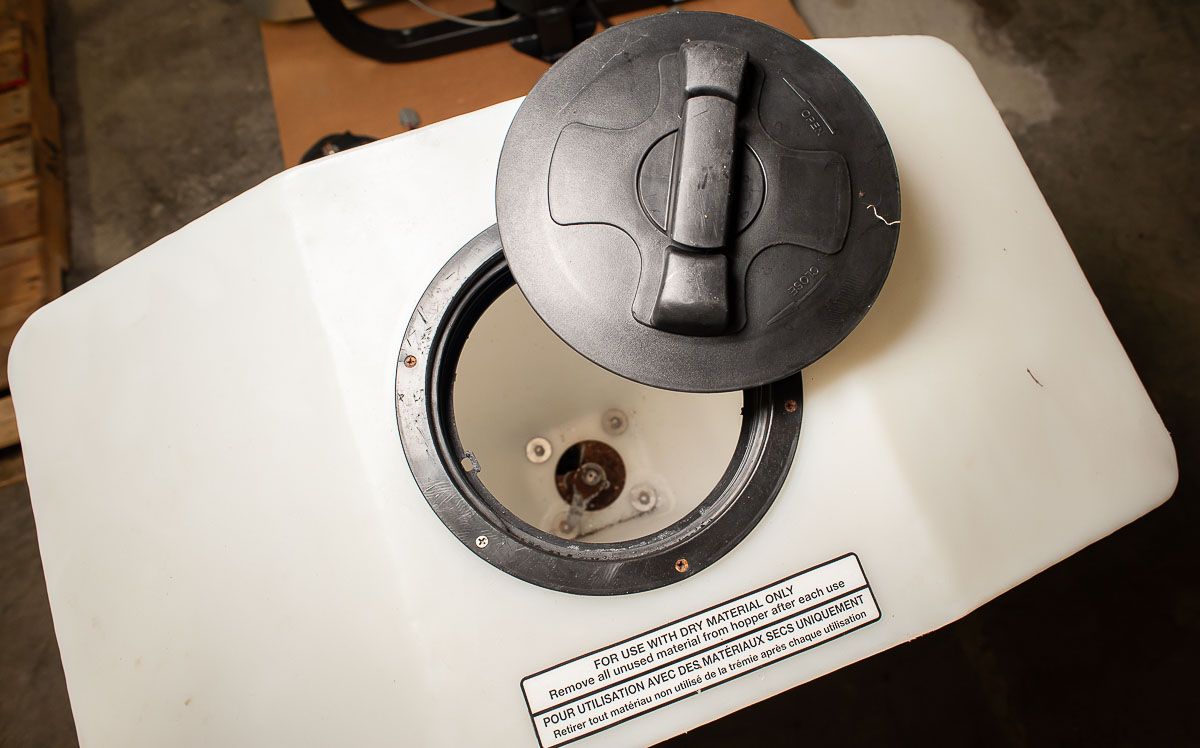 - 25-Gallon Hopper: Semi-transparent poly tank for easy monitoring of material levels.