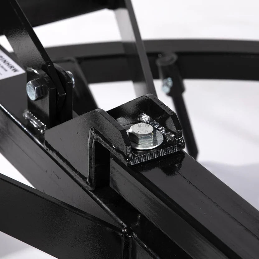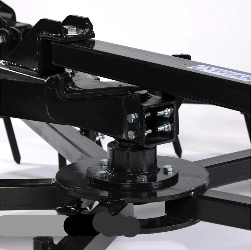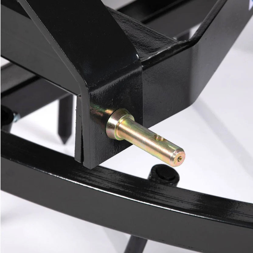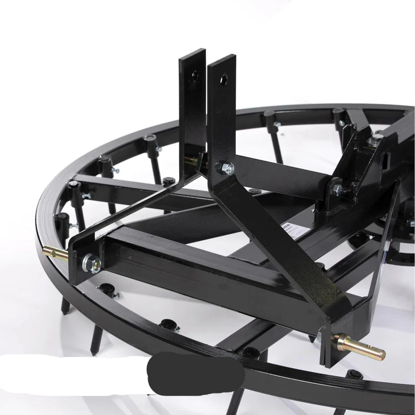 Level and condition your riding arena with precision using the 72" Arena Spin Harrow Groomer, designed for Category 1 tractors and compatible with Titan quick hitches. This self-driven rotary harrow requires no PTO, relying instead on the tractor’s forward motion to activate its rotating base, which mixes and redistributes soil in a circular motion for a smooth, even surface. The 35 hardened steel teeth loosen compacted ground and flatten uneven terrain, improving footing for horses and enhancing water absorption. The optional Rake Kit attaches either directly to your tractor’s 3-point hitch or to the harrow itself, offering 2.5" depth adjustability via a spring-loaded lever for precise grooming in a single pass. Built from 2" square steel tubing and finished in powder-coated black, this durable implement is ideal for equestrian arenas, training rings, and show grounds.