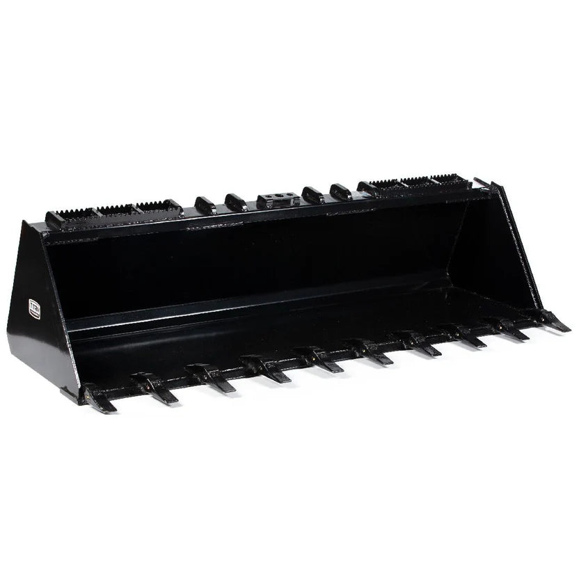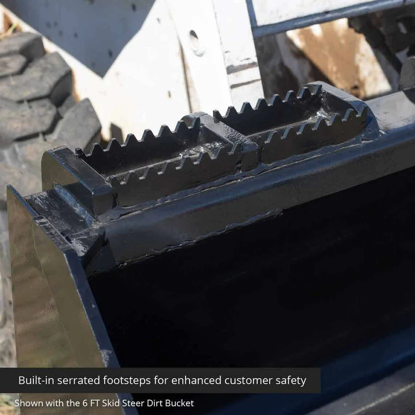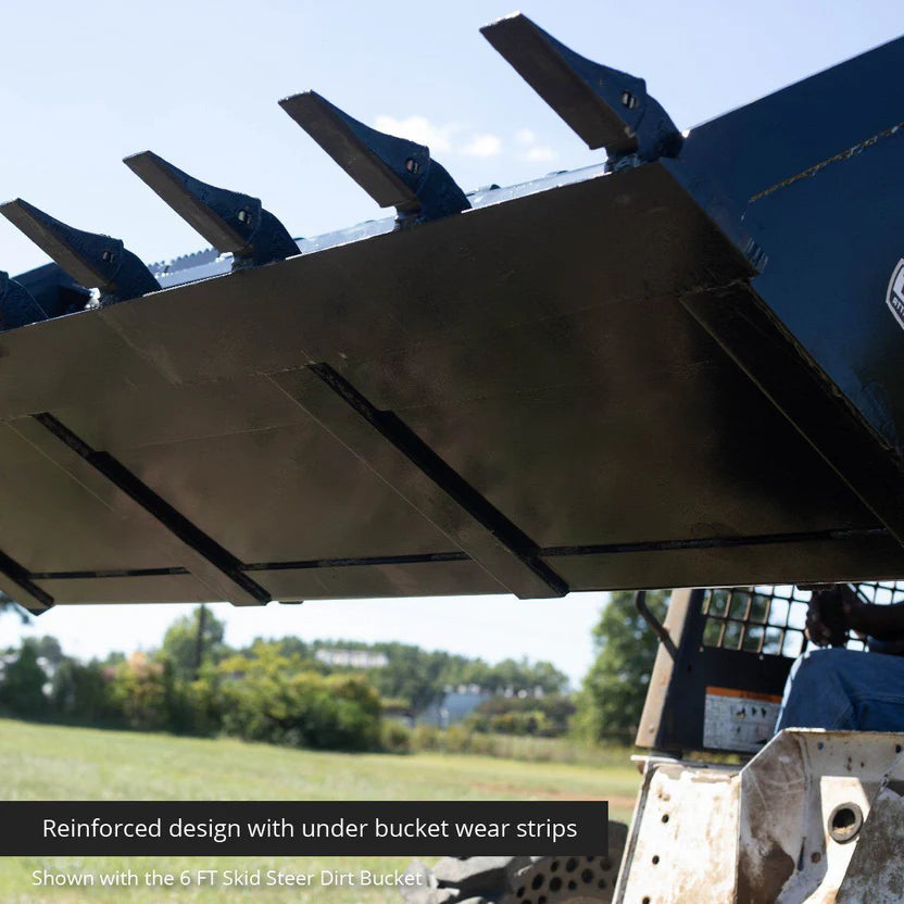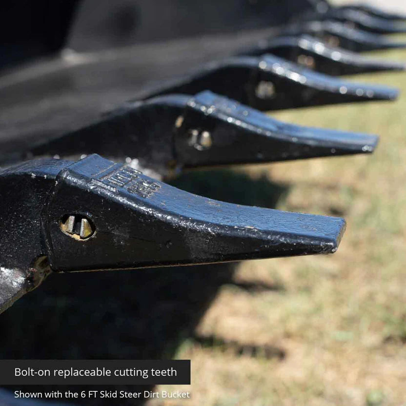 The Heavy-Duty Skid Steer Dirt Bucket With Teeth offers a rugged and versatile solution for landscaping, construction, and agriculture. Whether you're digging, grading, backfilling, or scooping gravel and snow, this low-profile bucket delivers premium performance across varied terrains. Crafted from A36 reinforced structural steel, the bucket incorporates bolt-on replaceable 6″ cutting teeth, under-bucket wear strips, and braced gusseted support to resist warping and structural fatigue under heavy load. Side cutters, a wide floor, and serrated footsteps enhance material flow and operator safety. Compatible with any machine using the Universal Skid Steer Quick Tach (SSQA), this attachment transforms your loader into a dirt-dominating workhorse. Choose from 72″ or 84″ width models based on your coverage and payload requirements.