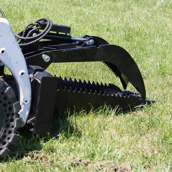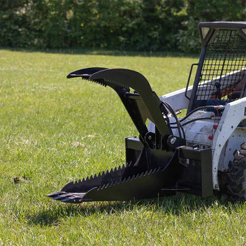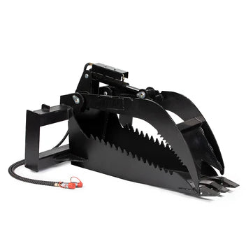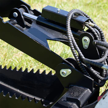 Designed for Kubota, Ford, New Holland, and other tractors with a universal skid steer quick tach system, this stump bucket features an aggressive serrated edge, replaceable cast bucket teeth, and a wide jaw opening to take on the most challenging tasks. Its 3,000 PSI hydraulic cylinder provides superior gripping force, while greaseable pins and bushings ensure long-lasting performance. A protective canvas sleeve shields the hydraulic hoses, preventing pinching and damage during operation.