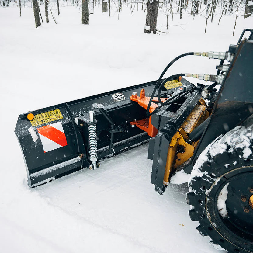 The Hydraulic Skid Steer Dozer Blade / Snow Plow turns your loader into a precision grading, clearing, and snow-moving powerhouse. Whether working construction sites, prepping driveways, or pushing rubble off the job path, this blade tackles everything from dirt and rock to snow and slush. Featuring a reinforced curved moldboard crafted from cold-rolled HD steel, the blade rolls material forward effortlessly, minimizing drag while maximizing capacity. Controlled hydraulically via a single-cylinder tilt system, the blade angles up to 28° left or right—adjustable directly from your cab. Spring-loaded impact shocks reduce blade bounce and protect loader arms from sudden jolts. Each model includes a reversible and replaceable 7/16″ bolt-on cutting edge, a Universal SSQA mount, and comes pre-equipped with flat-face couplers and hoses for seamless hydraulic hookup. Choose between 79″ or 92.75″ widths depending on coverage needs and loader size.