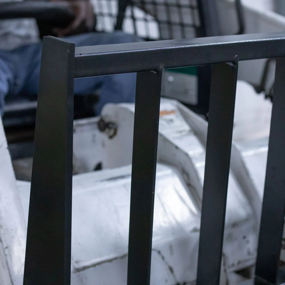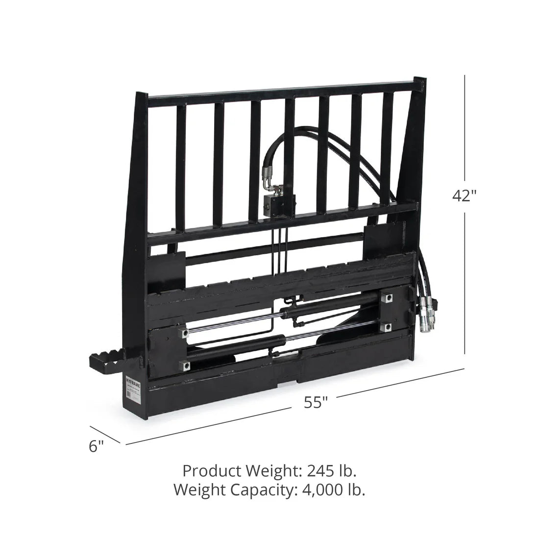 Its robust design includes dual hydraulic cylinders that provide smooth synchronized fork movement and keep blades perfectly centered. The frame is built from heavy-duty steel with a durable powder-coated black finish, supporting up to 4,000 lb of lifting capacity. A see-through headache rack enhances safety and visibility, while integrated side steps offer easy cab access. Whether you're stacking lumber, moving pallets, or shifting equipment, this adjustable fork frame is a powerful addition to any tractor or skid steer with SSQA capability.