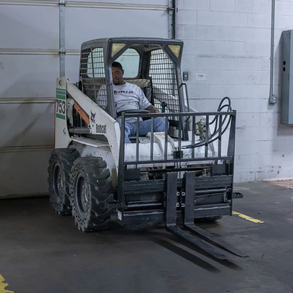 The Titan Attachments Standard Series Adjustable Hydraulic Pallet Fork Frame. Engineered for Universal Skid Steer Quick Attach (SSQA) compatibility, this hydraulic frame allows the operator to adjust fork spacing from 8″ to 40″ on center without leaving the cab—ideal for narrow aisles, pallet racks, and variable material sizes.