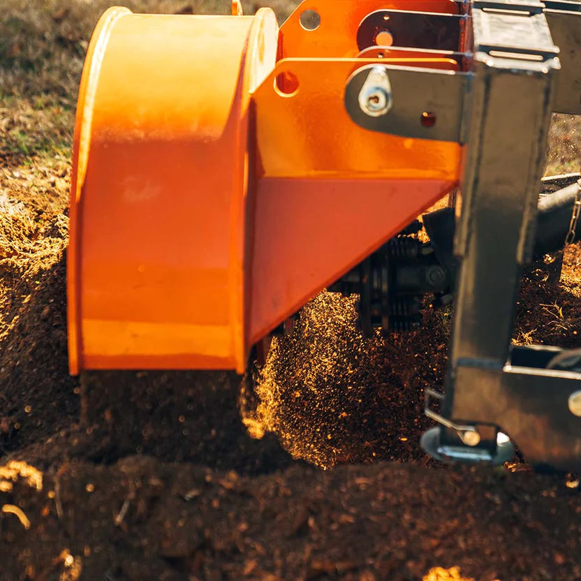 The Standard Series PTO Stump Grinder is a powerful and low-maintenance solution for eliminating tree stumps with precision and ease. Designed for Category 1, 3-point hitch tractors, this grinder operates without hydraulic components, reducing complexity and long-term maintenance costs. Its 24" diameter cutting wheel, spinning at 540 RPM, is equipped with 34 replaceable carbide shear blades that slice through wood and root systems with ease. With a cutting depth of 6.7" below ground, it ensures stumps are fully removed and covered, leaving no trace behind. The grinder includes a PTO shaft with a slip clutch for added durability and protection, while hinge pins allow the cutting wheel to float and follow ground contours, minimizing stress on the unit. The wheel remains visible from the operator’s seat, enhancing safety and control during operation. For transport and storage, a locking pin secures the wheel, and dual kickstands keep the unit stable when not in use.
