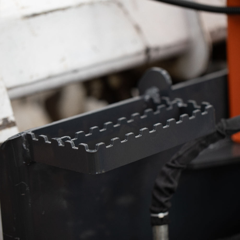 The Stump Grinder is an essential tool for anyone looking to efficiently remove tree stumps from their landscape. Featuring a 24" diameter cutting wheel equipped with 16 durable carbide face shear blades, this grinder ensures long-lasting performance and reliability. The heat-treated, abrasion-resistant teeth can be rotated three times before needing replacement, providing exceptional value and longevity. Designed for ease of use, the Stump Grinder connects to your skid steer via a universal hookup, making it compatible with most loaders. It operates at a powerful 3,000 PSI and delivers a cutting speed of up to 1,350 RPM, allowing for quick and effective stump removal. The grinder's cutting capabilities extend down to 19" below ground level, ensuring complete stump elimination. Convenience is key with this attachment; it comes with a five-button external controller that allows operators to adjust vertical and horizontal angles right from the cab. Additionally, the grinder includes a 14-pin adapter for electrical connection, which can be removed for direct battery hook-up. For added stability when unhitched, a kickstand is included to keep the implement level. This updated version now features Deutsch-style plug receptacles leading into the solenoids, simplifying the installation of new control and power harness applications.