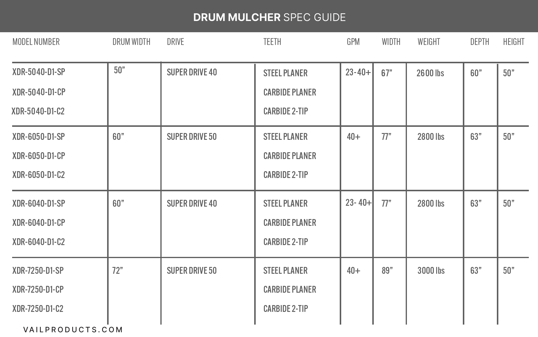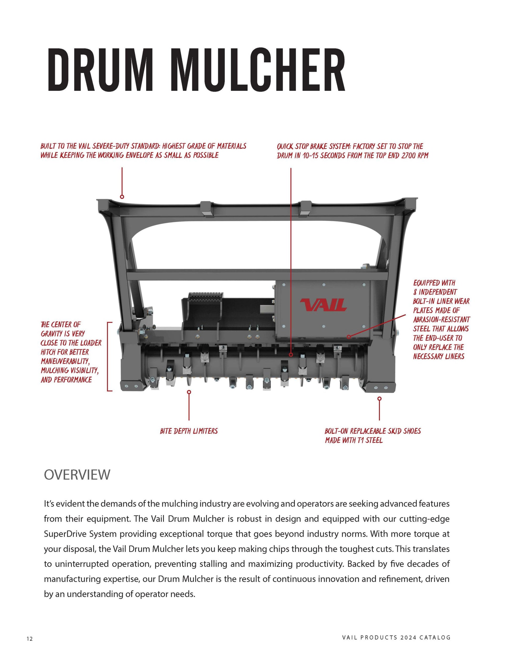 The Vail Products® Drum Mulcher is engineered to deliver exceptional performance, durability, and operator efficiency. Built with severe-duty components and high-grade materials, it is the ultimate attachment for land clearing, brush control, and forest management tasks.