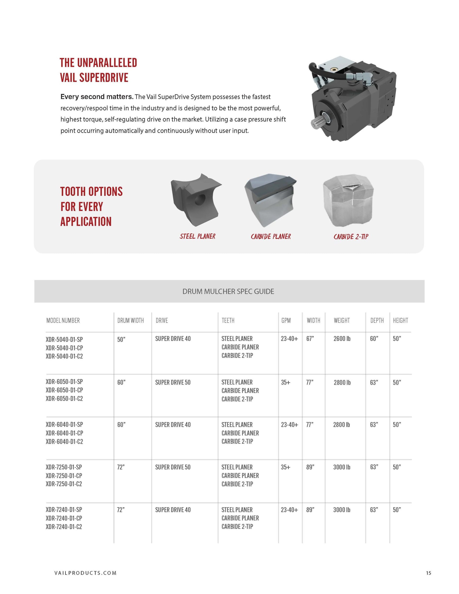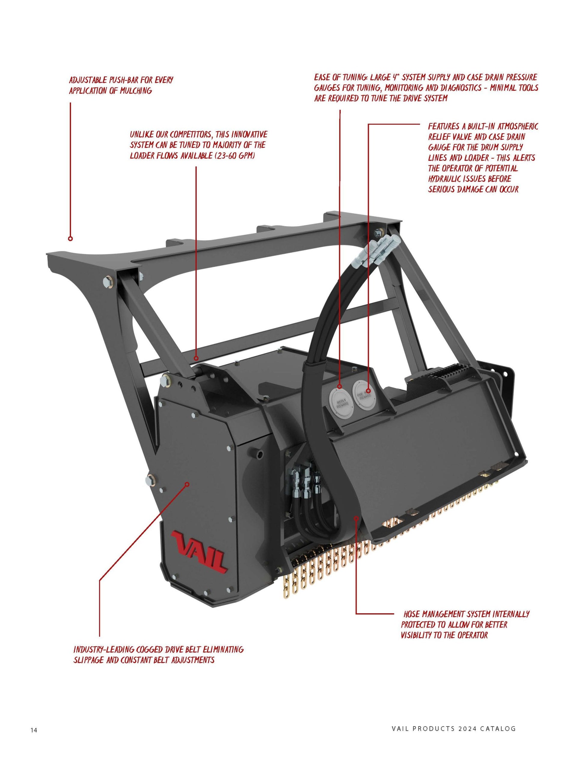 The Vail SuperDrive System ensures unmatched torque and automatic adjustments to maximize cutting efficiency, allowing operators to mulch trees effortlessly without the risk of stalling. The close center of gravity enhances maneuverability and visibility, ensuring precise operation in tight or rugged terrains.