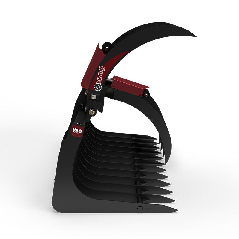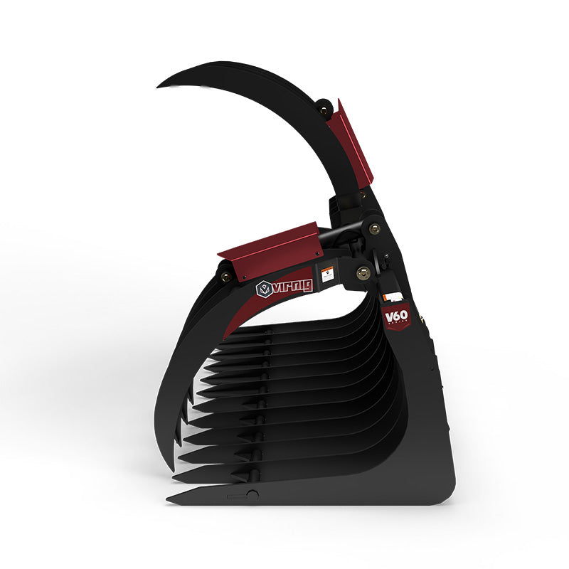 Designed with Virnig’s signature Grade 80 skeleton tines, NITROSTEEL® cylinder rods, and Teflon®-coated pivot bushings, the V60 Skeleton Grapple delivers exceptional clamping force, smooth operation, and extended service life in the harshest working environments. Its wide jaw opening of 62.8 inches allows operators to bite into large piles with ease, while fully gusseted tine tips maintain structural strength under heavy loads.