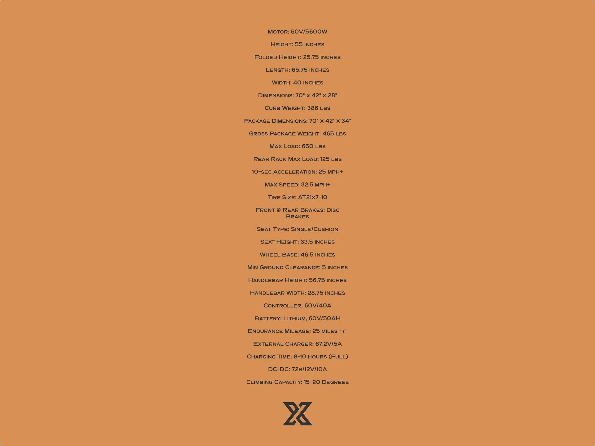 - Performance Specs: 0–25 MPH in ~10 seconds, max speed 32.5 MPH+, climbing capacity 15–20°