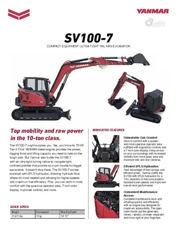The 2024 YANMAR SV100-7 is a powerful and versatile crawler excavator designed for compact excavation applications. Powered by a Tier 4 Final YANMAR 4TNV98CT-VBV2 diesel engine delivering 72 HP, this machine offers exceptional digging force, lifting capacity, and fuel efficiency. With a dig depth of 14 feet, operating weight of 21,671 lbs, and ultra-tight turning radius, the SV100-7 is ideal for navigating confined job sites. Equipped with 2PLS hydraulics, automatic 2-speed travel, and a spacious operator area with a 7-inch color display, this excavator ensures comfort, precision, and productivity. Comes with a 4-year/4,000-hour warranty for peace of mind.